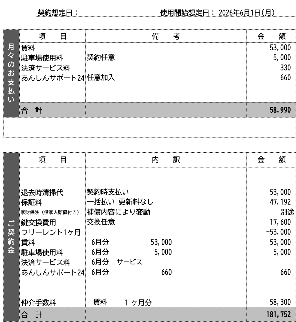 | その他契約時費用 | 鍵交換費用:17,600円(税込 交換は任意) 借家人賠償責任保険:補償内容により変動 保証会社加入料:月額賃料の80% 仲介手数料:58,300円(税込) 駐車場仲介手数料:5,500円(税込) |