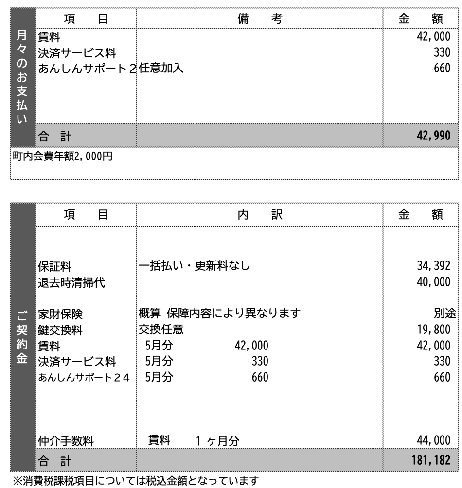 | その他月額費用 | 決済サービス料:330円 あんしんサポート24:660円(任意加入) 町内会費:年額2,000円 |